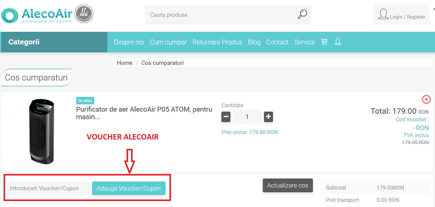 3Se va deschide pagina cu cosul de cumparaturi, in partea din stanga a paginii se afla casuta speciala pentru codul voucher/cupon Alecoair, unde veti introduce voucher-ul.