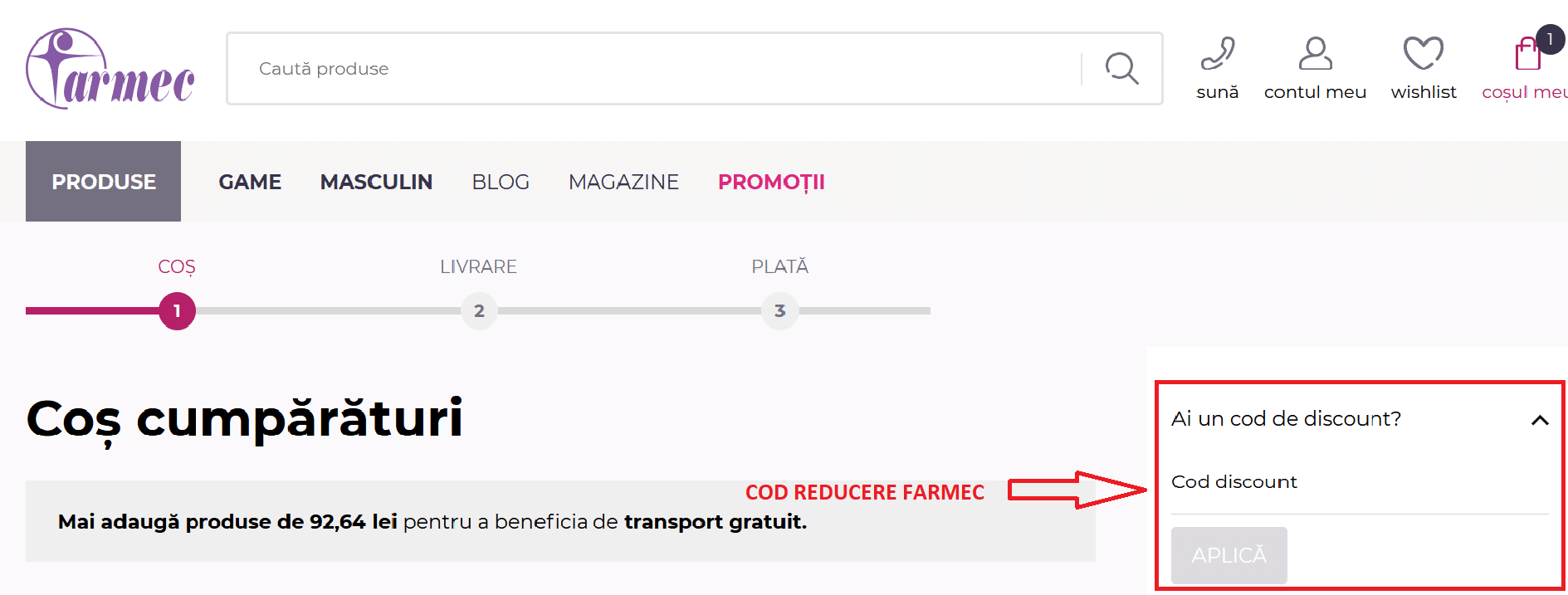 3In pagina cu cosul de cumparaturi, in partea de sus, din drapta a paginii se afla textul “Ai un cod de discount?”