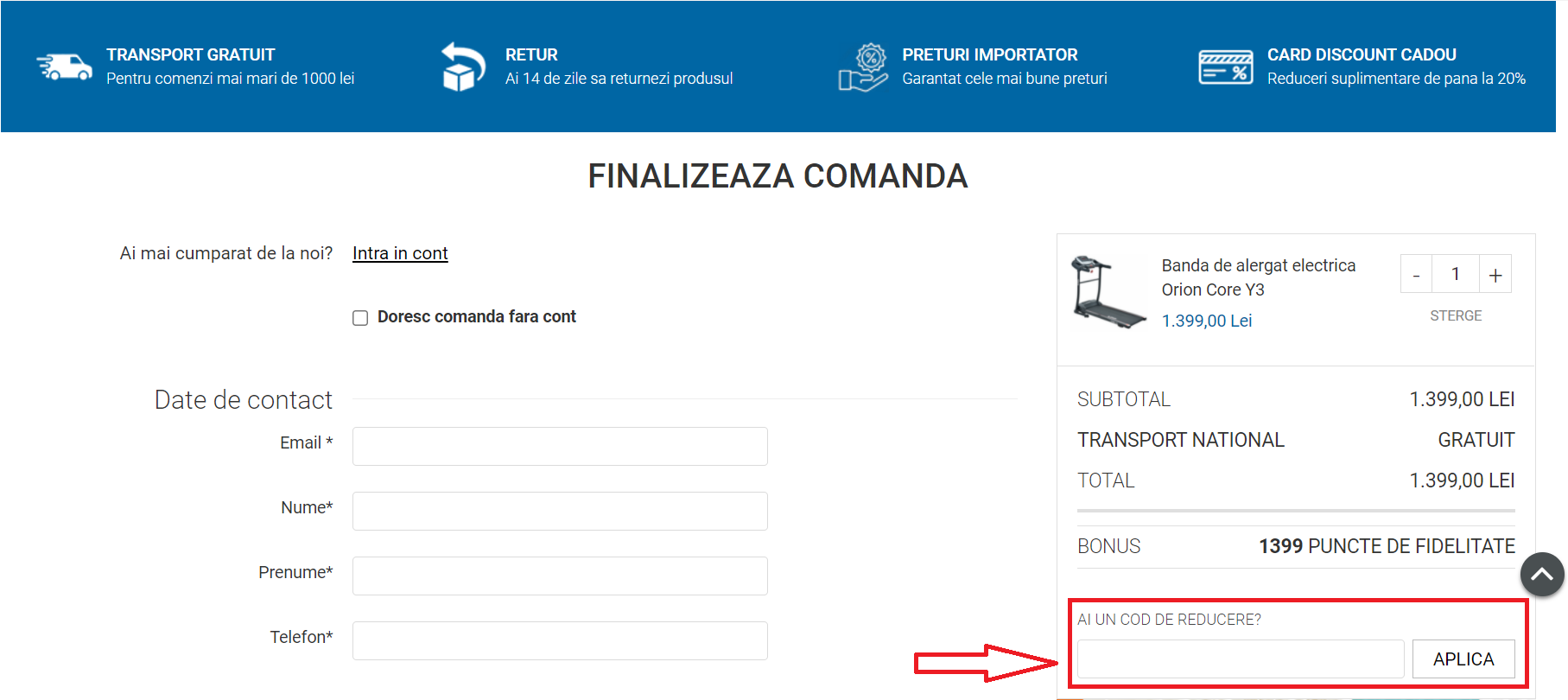 - In cosul de cumparaturi exista un camp special pentru codul de reducere unde trebuie să lipesti (paste) codul copiat anterior.