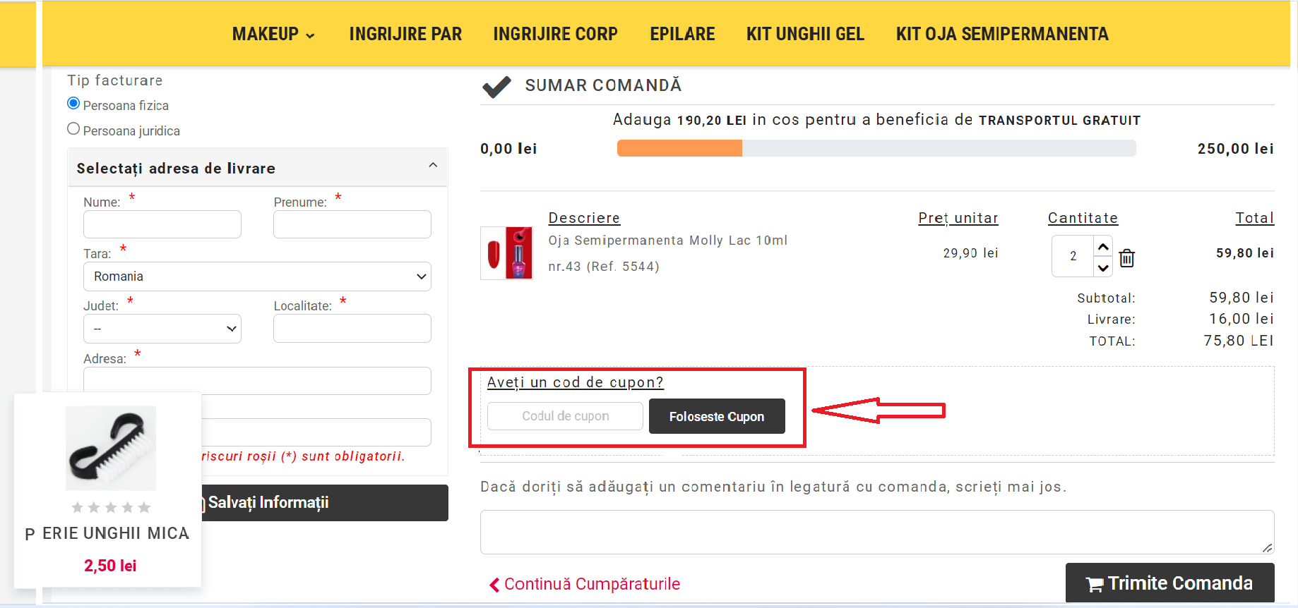 - In cosul de cumparaturi exista un camp special pentru codul de reducere unde trebuie să lipesti (paste) codul copiat anterior.