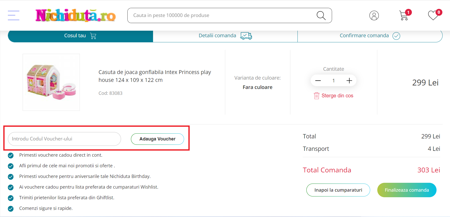- In cosul de cumparaturi exista un camp special pentru codul voucher unde trebuie să lipesti codul copiat anterior.