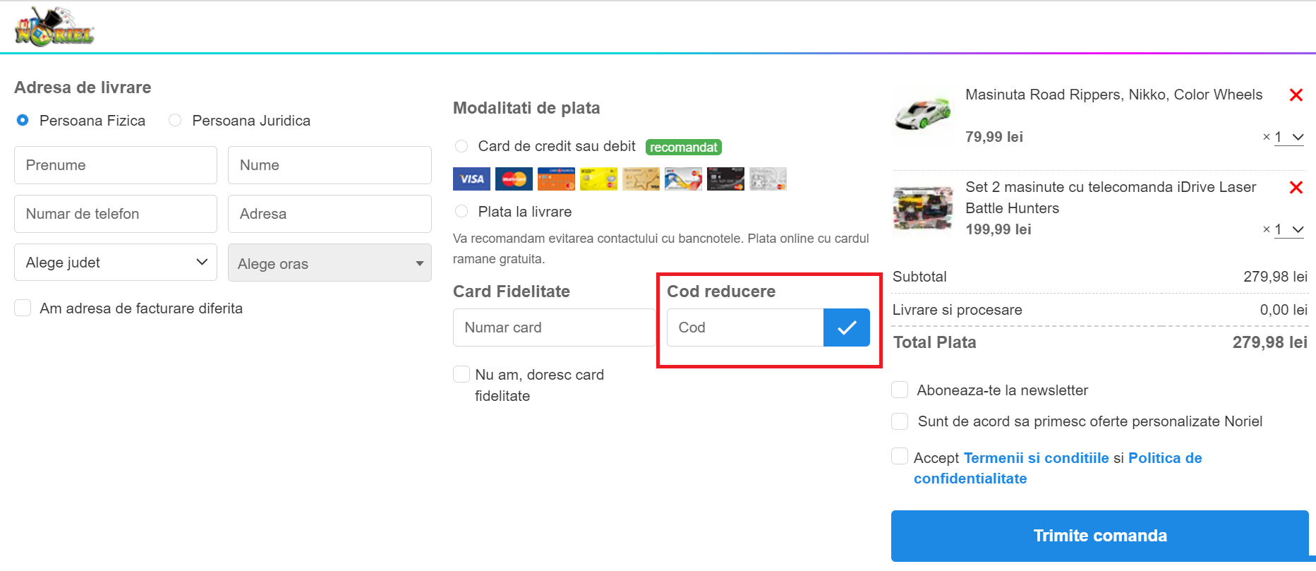 Jucariile preferate ale copiilor sunt usor de achizitionat pe noriel.ro. Foloseste un cod reducere Noriel care poate sa va aduca un discount de 20% si bucura-te de cele mai bune preturi. Urmeaza pasii de mai jos.