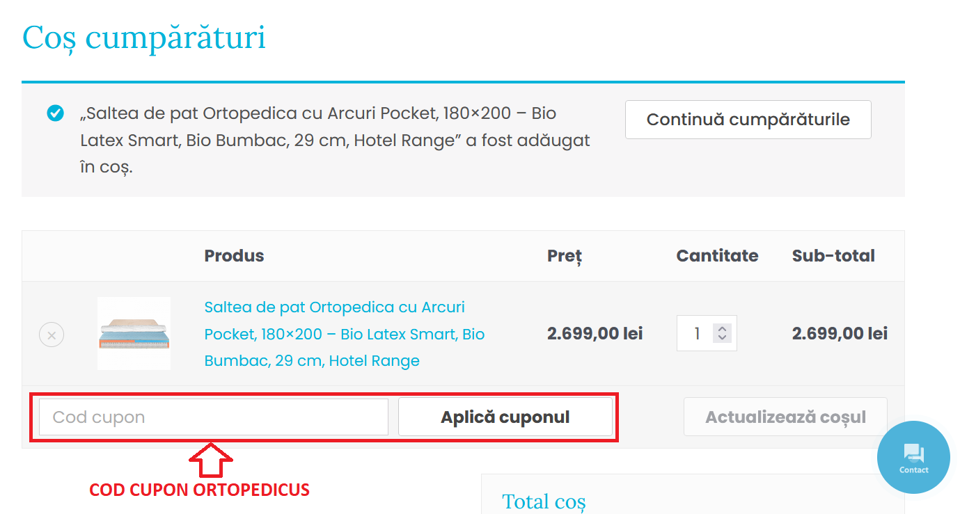 3In pagina cu cosul de cumparaturi, sub sumarul comenzii, se afla casuta speciala pentru cupon, unde veti introduce codul pe care il veti gasi pe site-ul nostru www.codcupoane.ro. Apoi dati click pe casuta “Aplica cuponul” si veti obtine discountul.