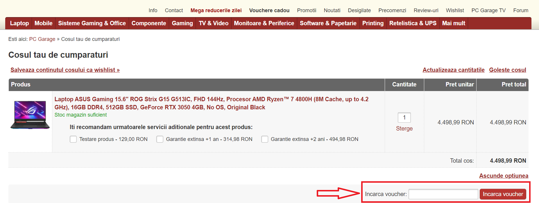 - In cosul de cumparaturi exista un camp special “Incarca voucher” unde trebuie să lipesti (paste) codul copiat anterior.